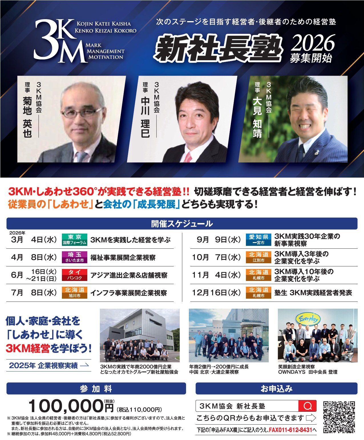※3KM協会 法人会員の経営者・後継者の方は「新社長塾」に参加する権利がございますので、法人会員と重複して参加料を振込む必要はございません。